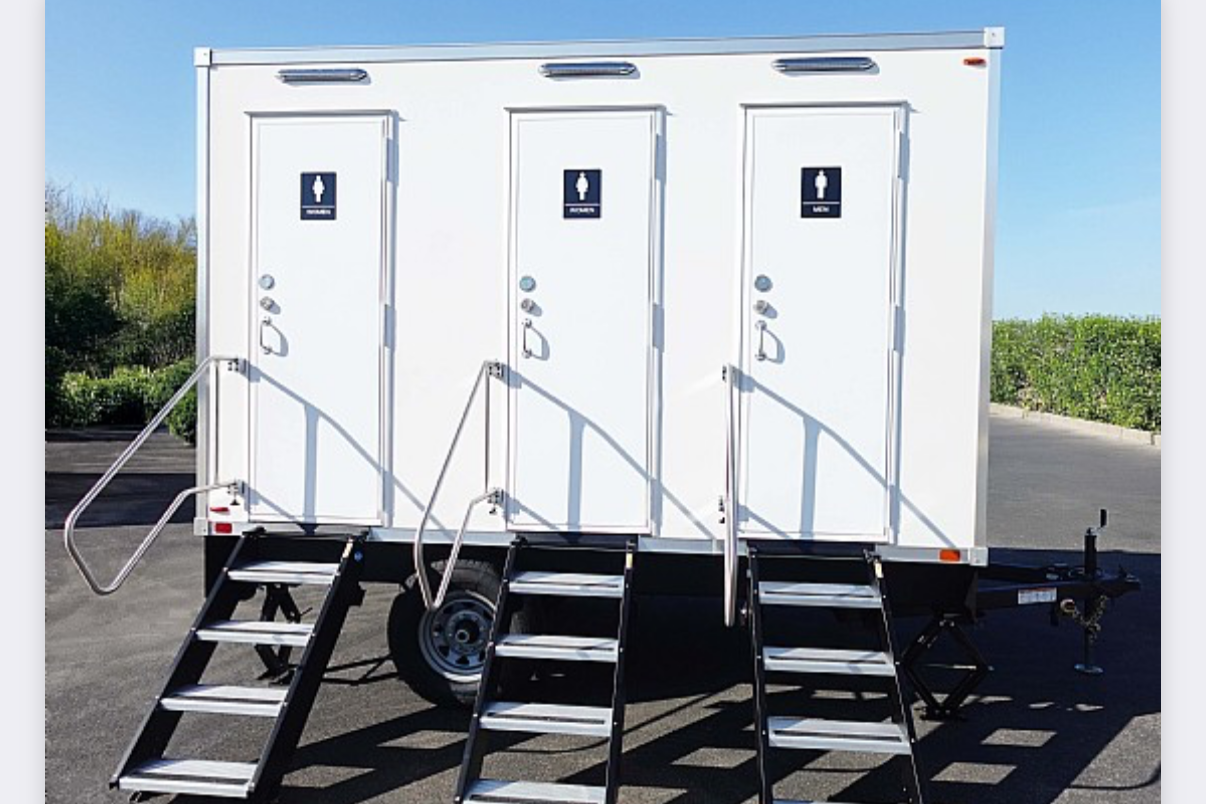 The Porcelain Suite offers a 3-station luxury restroom trailer with fresh hot/cold water, fully flushing toilets, climate controlled stalls, interior/exterior lighting, and high-end finishes.